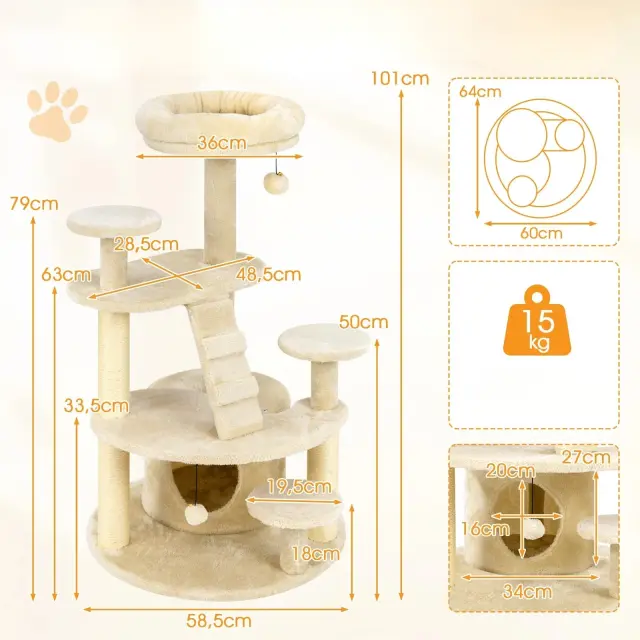Zasnova, ki varčuje s prostorom: S površino 58,5 cm x 58,5 cm se mačje plezalno drevo 64 x 60 x 101 cm (d x š x v) zlahka prilega majhnim sobam ali kotičkom in je idealno za stanovanja ali vse, ki želijo prihraniti prostor.