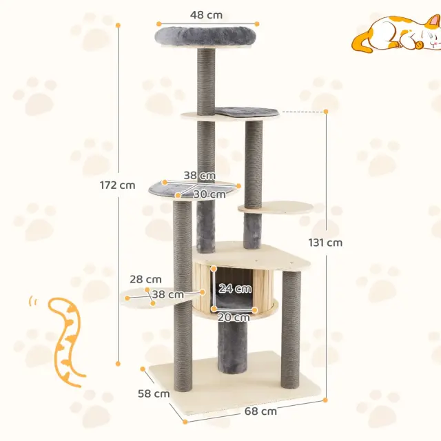 Iščete idealno praskalno mesto, kjer se lahko vaše mačke igrajo, sproščajo in raziskujejo brez skrbi? Ta stolp za mačke izpolnjuje točno te zahteve. Spodbuja naravno plezanje in raziskovanje, odlično izkorišča navpični prostor in prihrani prostor na tleh. Zato se brezhibno prilega vsakemu kotičku in je idealen tudi za majhna stanovanja. Udobna mačja hišica z letveno konstrukcijo ponuja veliko prostora za počitek in skrivanje, mehko oblazinjena notranjost pa zagotavlja optimalno udobje za vašo mačko. Visoka mačja hišica ima široko zgornjo ploščad, ki je kot nalašč za počitek, opazovanje ali sončenje; zgornja blazina je za vaše udobje odstranljiva in jo je mogoče prati v pralnem stroju. Mačje plezalo je opremljeno z odstranljivimi blazinami za poletno in zimsko uporabo, gladka površina pa omogoča enostavno čiščenje.