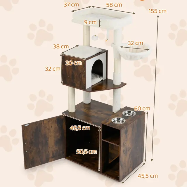 Premišljene podrobnosti in dimenzije: Dve posodi za hrano olajšata hranjenje mačk, medtem ko viseča igralna žoga zagotavlja dodatno zabavo za vašo hišno mačko. Skupne mere: 72 x 45,5 x 155 cm (d x š x v).