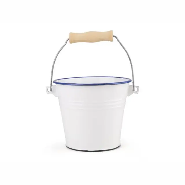 Vedro z lesenim ročajem, premera 14 cm, v beli barvi z modro obrobo, je čudovit dodatek v vintage stilu. Izdelano je iz emajla, ki združuje trpežnost in estetsko privlačnost. Lesen ročaj omogoča udoben oprijem, kar olajša prenašanje tudi, ko je vedro polno. Njegov retro videz z belo osnovo in elegantno modro obrobo prinaša pridih nostalgije in rustikalnega šarma. Vedro je večnamensko: uporabljate ga lahko za shranjevanje kuhinjskih pripomočkov, kot cvetlično vazo, za hlajenje pijač, za serviranje ali celo kot dekorativni kos v notranjosti ali na vrtu. Zaradi emajlirane površine je odporno na rjo in enostavno za čiščenje.