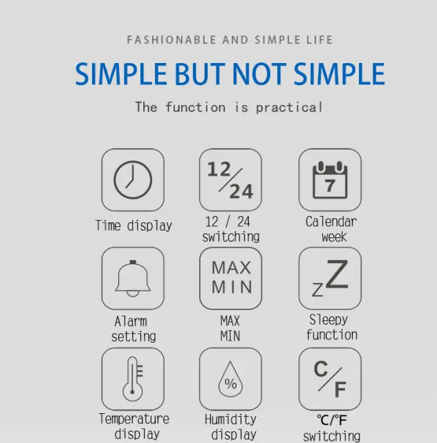 Večfunkcijska zasnova: Ta ura ne prikazuje samo časa. Prikazuje datum, dan v tednu, notranjo temperaturo (°C/°F) in stopnjo vlažnosti ter tako na prvi pogled zagotavlja celovite informacije o okolju.