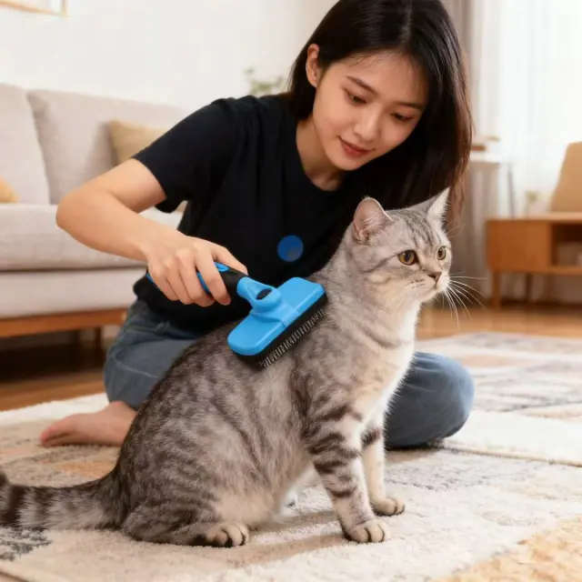 Enostavno samočiščenje: Zasnova z izvlečnimi ščetinami omogoča enostavno čiščenje te krtače za hišne ljubljenčke. S preprostim pritiskom na gumb se ščetine umaknejo in sprostijo zbrano dlako za enostavno odstranjevanje. Ta funkcija samočiščenja vam prihrani čas in trud, kar vam omogoča, da se osredotočite na uživanje kakovostnega časa s svojim ljubljenčkom. Ni vam več treba ročno odstranjevati dlake s krtače – ta inovativna zasnova poenostavlja postopek nege in ohranja krtačo čisto in higienično za prihodnjo uporabo. Ta funkcija je še posebej uporabna za lastnike hišnih ljubljenčkov, ki pogosto negujejo svoje ljubljenčke.