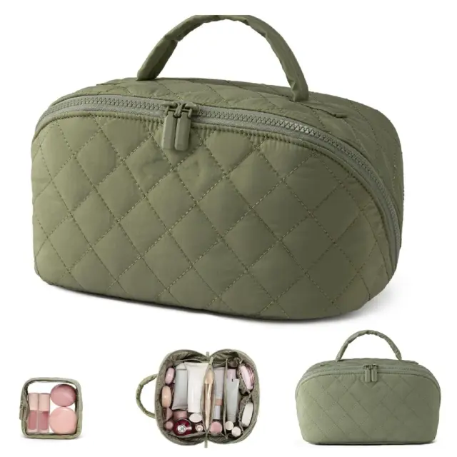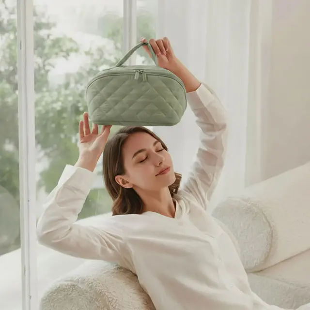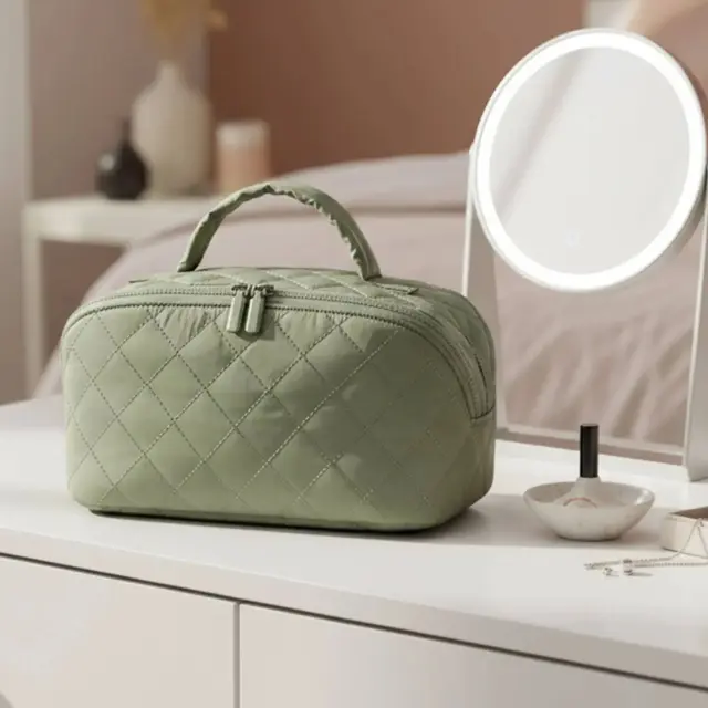 Zasnovana za ženske, ki cenijo lepoto in udobje, ta napihnjena kozmetična torbica zlahka sprejme vse vaše vsakodnevne izdelke za ličenje in nego kože, hkrati pa ohranja svojo obliko in strukturo.