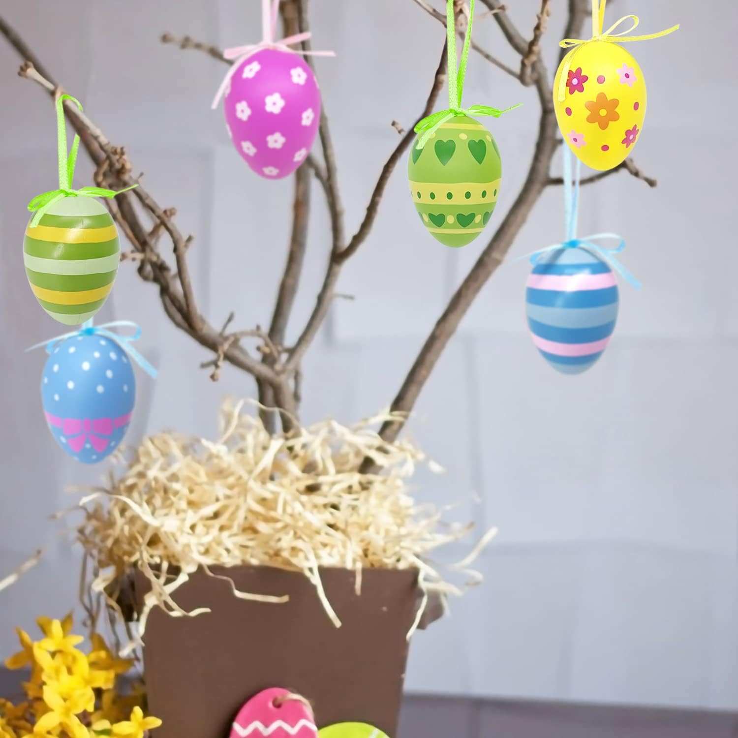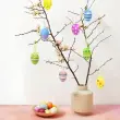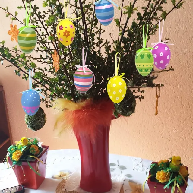 Aviski viseča velikonočna jajca predstavljajo celovit dekorativni set, ki v vsak prostor vnese spomladansko svežino in praznično razpoloženje. Komplet vsebuje štiriindvajset jajc izdelanih iz kakovostne plastike, kar zagotavlja dolgo življenjsko dobo in odpornost na morebitne poškodbe pri uporabi. Vsak posamezen kos je ročno poslikan z unikatnimi motivi, ki vključujejo vse od pik do cvetličnih vzorcev, kar omogoča raznoliko in vizualno privlačno krasitev. Zaradi praktičnih trakov so jajca primerna za takojšnjo namestitev na veje, okna, vence ali v praznične košarice.