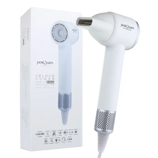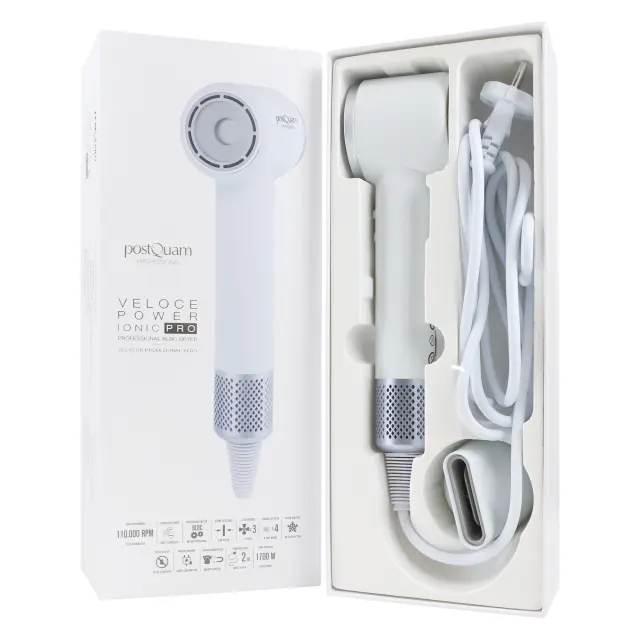 "Sušilnik za lase BLDC VELOCE POWER IONIC PRO združuje moč, tehnologijo in stil v presenetljivo lahki in enostavni za uporabo zasnovi. Zasnovan je za zagotavljanje stalnega in natančnega pretoka zraka ter ima profesionalni motor BLDC, ki doseže 110.000 vrtljajev na minuto, kar zagotavlja hitro sušenje tudi gostih las. Njegov 2-metrski kabel omogoča popolno svobodo gibanja, gladek na dotik pa zagotavlja udobno in varno izkušnjo pri vsaki uporabi.