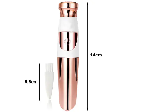 Neboleče odstranjevanje dlak Enostaven za uporabo Ne draži kože Eleganten dizajn Deluje na baterije: 1 x AA (ni priložena) Majhna in priročna Priložena ščetka za čiščenje Dimenzije: 14 cm x 3 cm