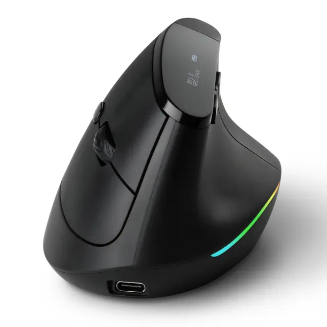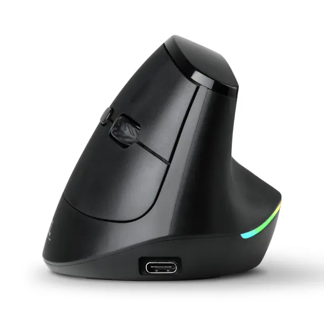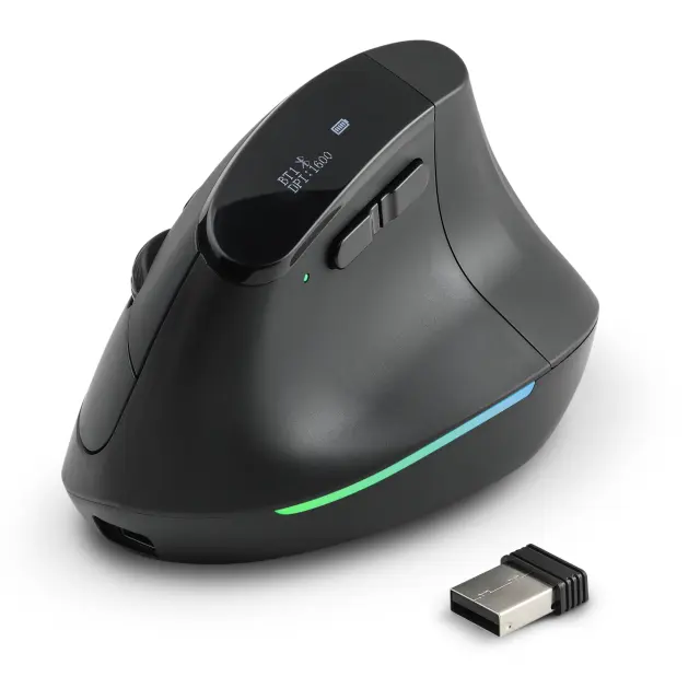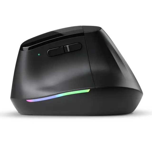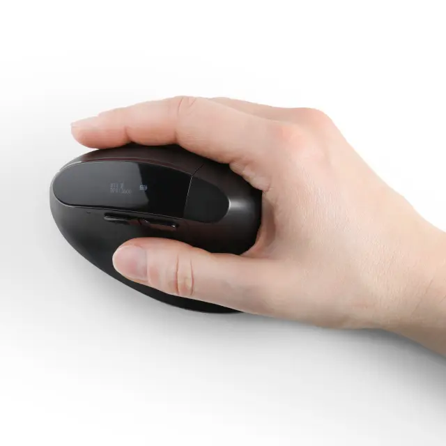 CSL ErgoGrip je vrhunska vertikalna miška, zasnovana z neprestanim poudarkom na ergonomiji in intuitivni uporabi. Njena edinstvena oblika omogoča naravni položaj roke, s čimer učinkovito preprečuje utrujenost med dolgotrajnim delom ali igranjem. Ena od njenih glavnih značilnosti je vgrajen prikaz stanja na zgornji strani, ki vas ves čas obvešča o trenutnem načinu povezave, izbrani nastavitvi DPI in stanju baterije. Zahvaljujoč vsestranski povezljivosti lahko miško povežete s svojimi napravami prek brezžične povezave 2,4 GHz, dveh kanalov Bluetooth ali klasičnega USB-kabla.