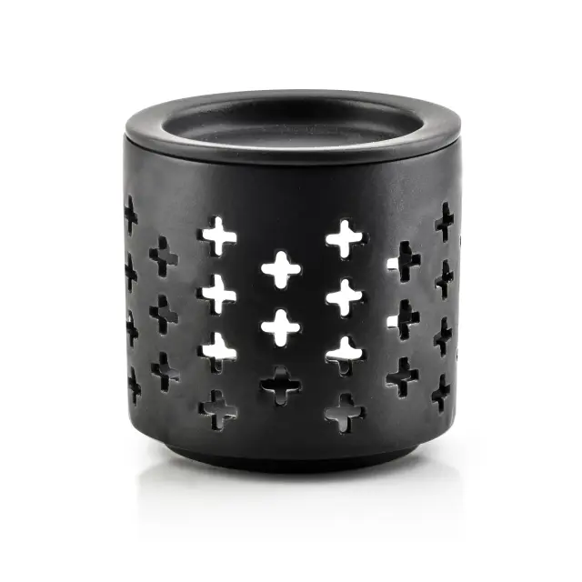 VESTA Dišeči kamin na olje 7,3xV: 7,5cm Keramični dišeči oljni gorilnik VESTA - mat črn, dvodelni z luknjo zgoraj in ob strani, mere: 7,3x7,3xV: 7,5cm