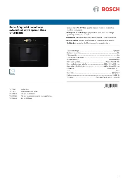 BOSCH CTL9181D0 Serie 8 vgradni popolnoma avtomatski kavni aparat