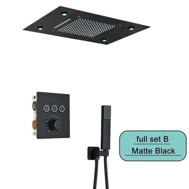 Vgrajen stropni tuš set, dežni tuš glava, LED svetlobna funkcija, stenska zasnova, črn celoten s