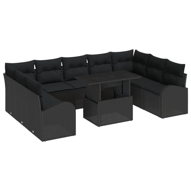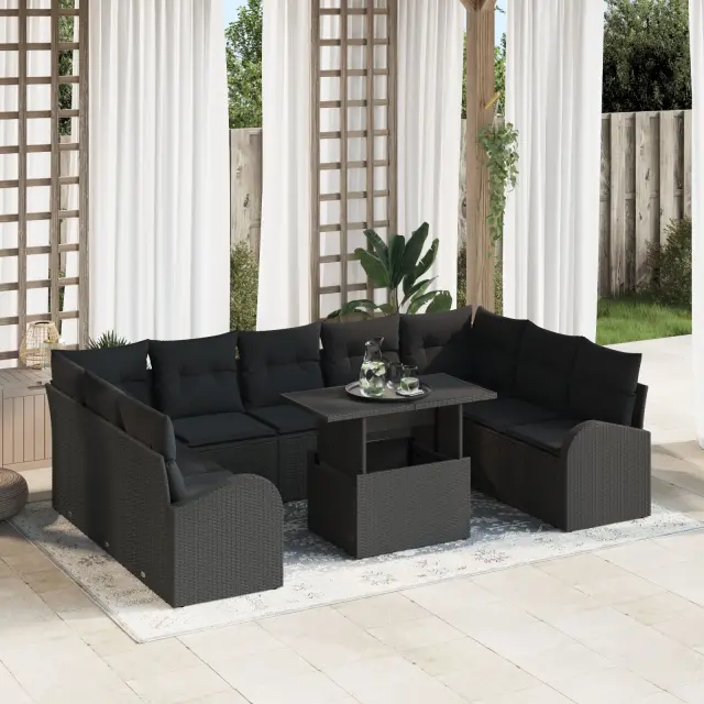 Ta 10-delna vrtnarska sedežna garnitura združuje stil in udobje ter ustvarja sproščen prostor za druženje s prijatelji in družino. S sodobnim dizajnom in kombinacijo črnega poli ratana ter udobnih odstranljivih blazin, iskanja idealna izbira za balkone, patio ali vrtove.