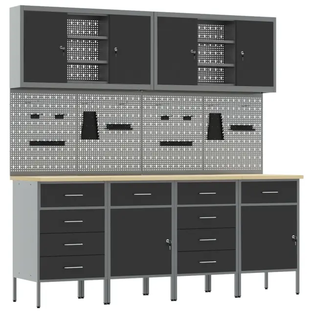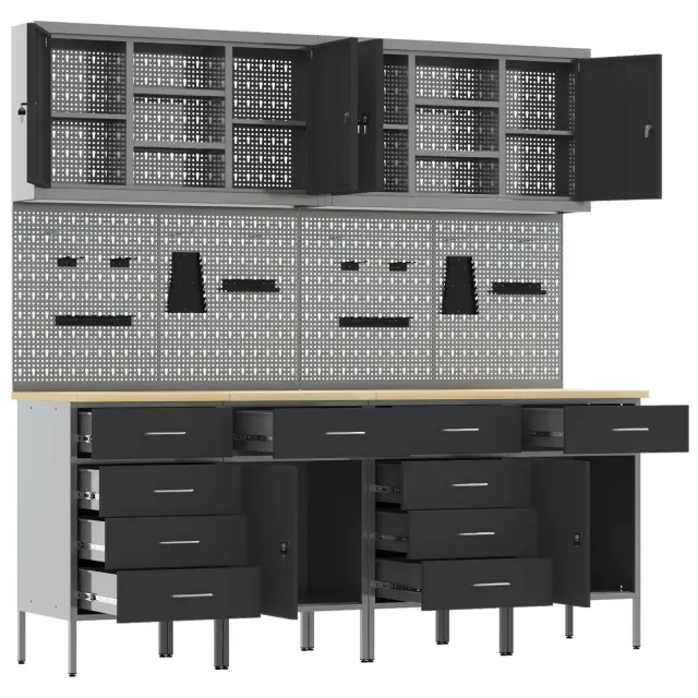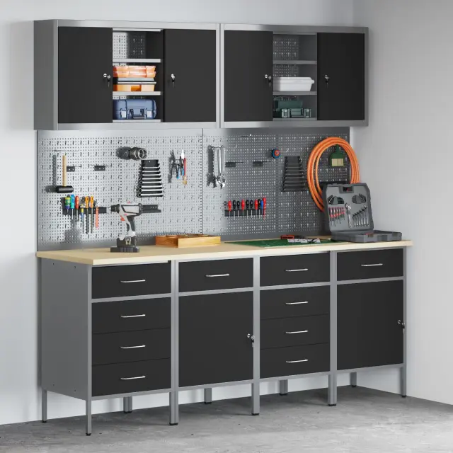 Ta industrijska delovna omarica je top rešitev za shranjevanje v delavnicah in garažah, kjer potrebujete vzdržljivost in organizacijo. Narejena iz robustnega jeklenega okvirja in inženirskega lesa, njena mat površina in leseni vzorci ji dajo profesionalen videz, ki se lepo ujema s katerimkoli delovnim prostorom, pri tem pa nudi odlično funkcionalnost.