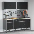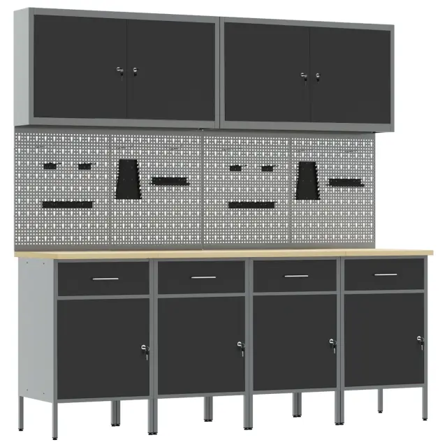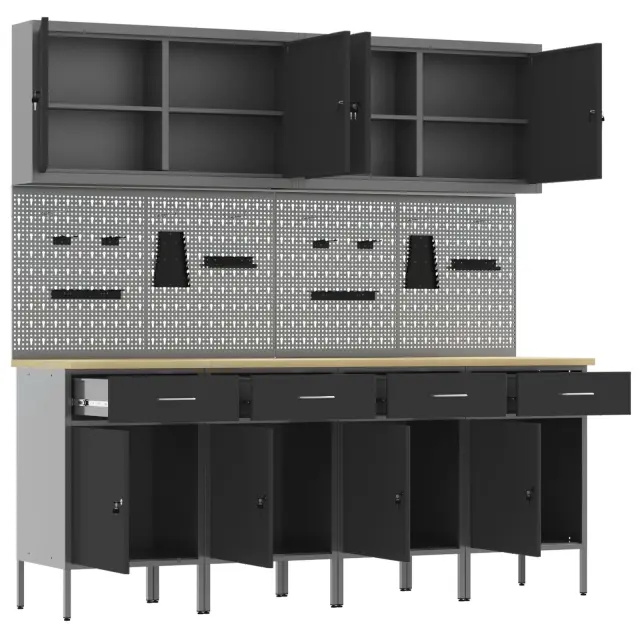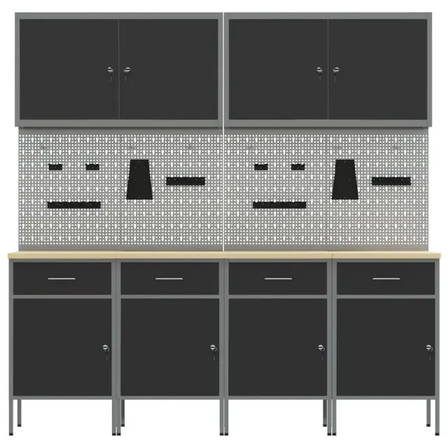 Ta omara za shranjevanje v delavnici z nastavljivo višino je vse o stilu in funkcionalnosti, idealna za vsakogar, ki želi obdržati svojo garažo ali delavnico organizirano. Njen eleganten črno-siv dizajn prinaša sodoben pridih vsakemu industrijskem prostoru, hkrati pa ponuja ogromno shranjevanja za orodja in opremo.