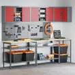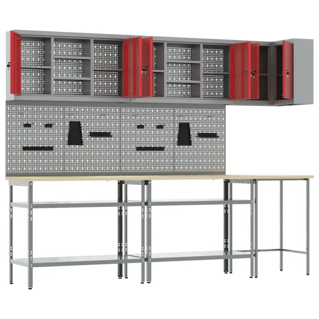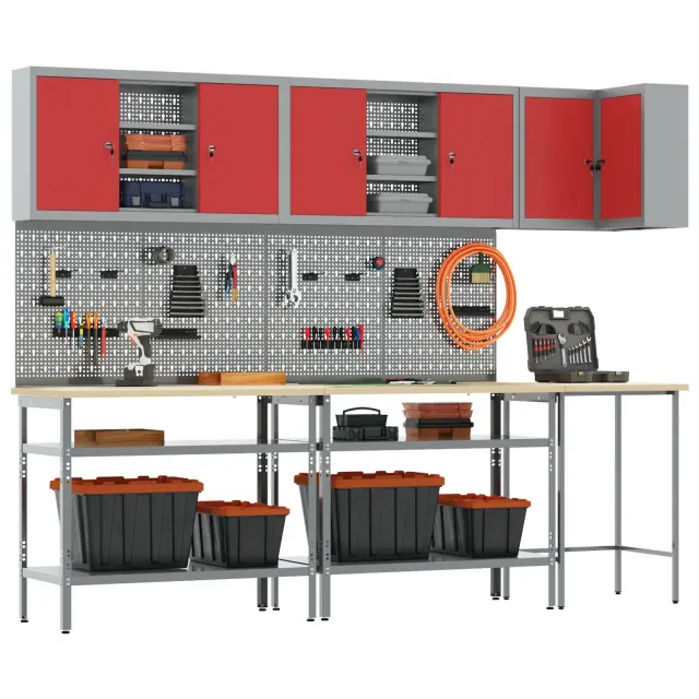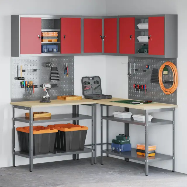 Ta industrijski kotni set za shranjevanje mize je narejen, da izboljša tvoje shranjevanje in učinkovitost v delavnici ali garaži, ob tem pa tudi odlično izgleda. S preprosto sivo končno obdelavo in rdečimi detajli, ima več miz in omar, ki ti pomagajo organizirati orodja, da so enostavno dosegljiva, in ohranja moderno estetiko.