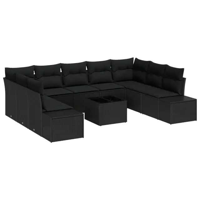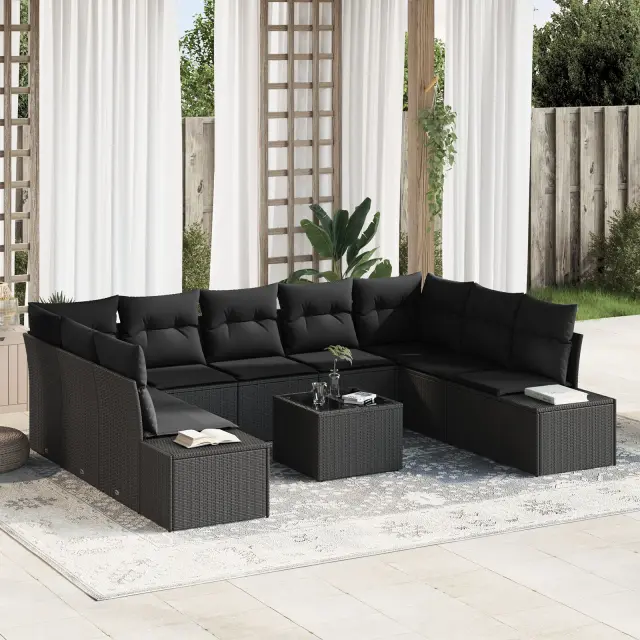 Ta 10-delna modularna zunanja sedežna garnitura ponuja stilno in udobno mesto za sprostitev v tvojem vrtu, na terasi ali balkonu. S svojo elegantno črno barvo se popolnoma sklada s katerim koli zunanjim stilom in je odlična za družabne dogodke. Z lahkoto lahko ustvariš idealno območje za sprostitev.