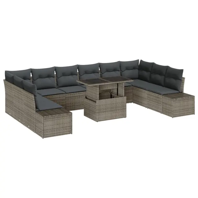 Ta 11-delni sivi poli ratan vrtni kavč dvigne sproščanje na višji nivo s svojim modernim videzom in super priročnimi lastnostmi. Ima eleganten dizajn in vgrajeno shranjevanje, kar je super za druženje s prijatelji ali preprosto relaxiranje na vašem balkonu, terasi ali vrtu. Vsaka komponenta je zasnovana z mislijo na udobje, da se lahko sprostite ob uživanju v družbi.