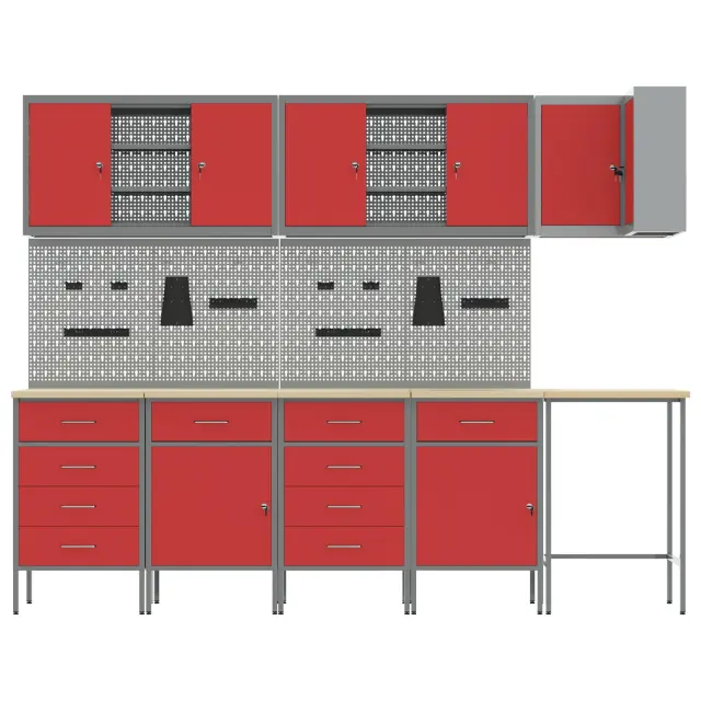 Ta priročen komplet omaric za delo povezuje funkcionalnost z udobnim industrijskim slogom, kar je idealno za to, da tvoja garaža ali delavnica ostane organizirana. Narejena je močno iz inženirskega lesa in jekla, kar ne le dobro izgleda, ampak nudi tudi veliko prostora za tvoje orodje in materiale, vse vedno pri roki za tvoj naslednji projekt.