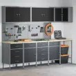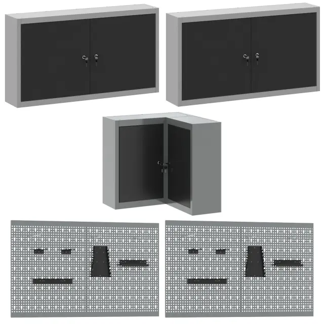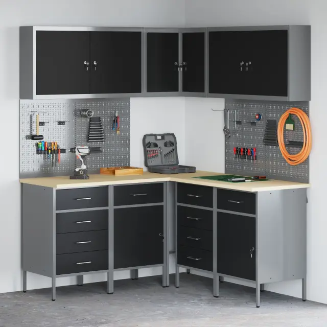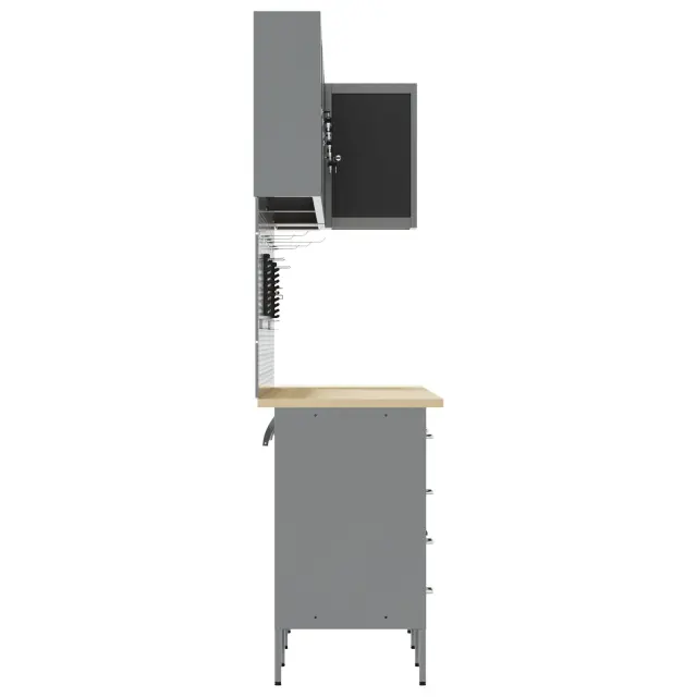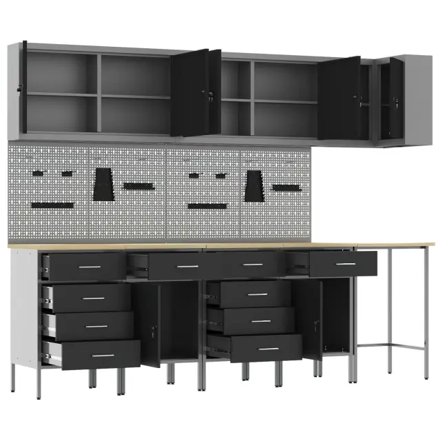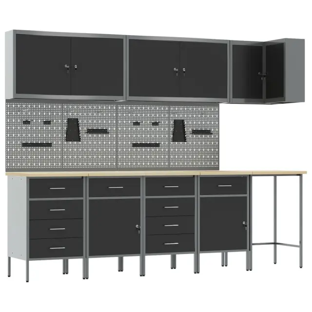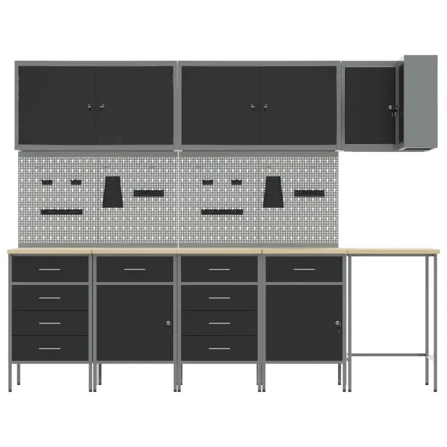 Ta industrijski set omar za delavnico je narejen za tiste, ki želijo praktično in stilsko delovno okolje. Narejen iz močnega jekla in inženirskega lesa, se osredotoča na učinkovitost in organizacijo. Popoln je za garaže, delavnice ali utilitarne prostore, saj se ponaša s sodobnim črnim in sivo zaključkom, ki res dobro izgleda v vsakem dekorju, hkrati pa ponuja ogromno prostora za tvoje orodje in potrebščine.