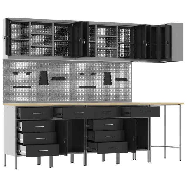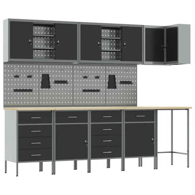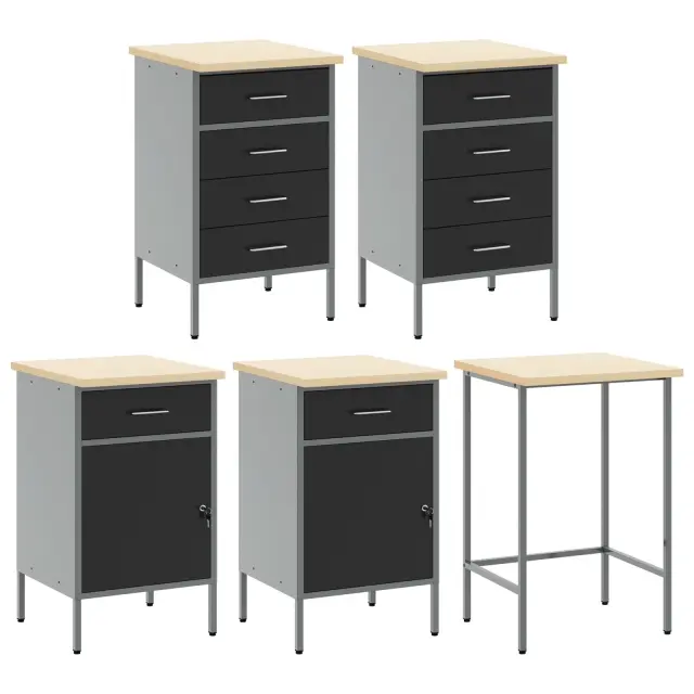 Ta industrijski shranjevalni kabinet za delavnico združuje moč in stil, kar ga naredi super za vsako garažo ali delavnico. Narejen je iz močnega jekla in inženirskega lesa, njegova elegantna črna in siva zasnova pa je funkcionalna in doda pridih šarma tvojemu prostoru.