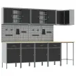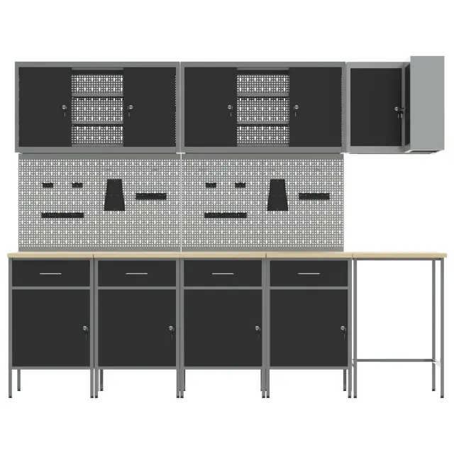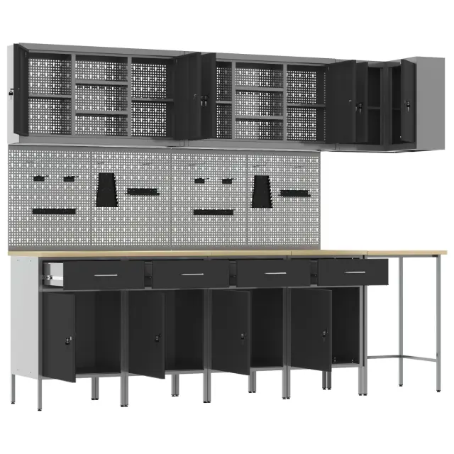 Ta industrijski kabinet je zasnovan, da izboljša tvoje delovno okolje s funkcionalnostjo in trendovskim videzom. Velikost 255 x 55 x 220 cm, trdna jeklena konstrukcija in inženirski les zagotavljajo, da so tvoji orodji in materiali organizirani v delavnicah, garažah ali obrtnem prostoru.