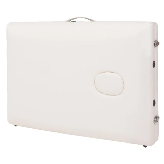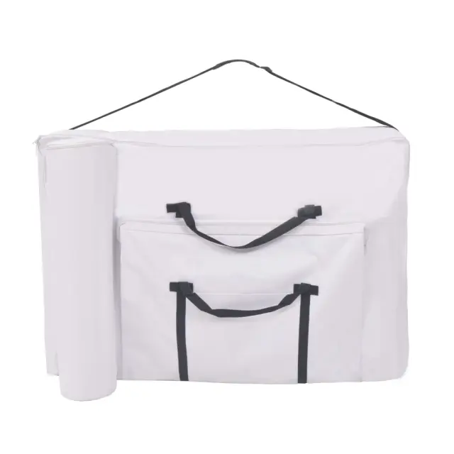Komplet, ki vključuje zložljivo 2-consko masažno mizo, stolček za masiranje, okroglo in polkrožno valjasto blazino bo idealen za profesionalno in zasebno uporabo. Masažna miza in stolček imata trden lesen okvir za vzdržljivost in sta oblazinjena v visokokakovostno umetno usnje. Luksuzen, izjemno debel sedež stolčka in ležalna površina mize, vzglavnik in stranski nasloni za roke nudijo izjemno udobje. Vzglavnik in sprednja polica za roke mize sta nastavljiva, prav tako višina mize, kar uporabniku omogoča udobno ležanje, maserju pa izbiro želene delovne višine. Stolček se enostavno zloži za shranjevanje in transport Dve priloženi blazini različnih oblik se lahko uporabljata za različne namene. Lahko ju namestite pod kolena, gležnje ali spodnji del trebuha za podporo ali položaj. Masažno mizo lahko enostavno zložite in shranite v prenosno torbo v obliki kovčka, kar olajša prenašanje in shranjevanje. Torba za prenašanje je priložena.Barva: BelaMaterial: Umetno usnje (100 % PVC), trden lesMasažna miza:Velikost (z naslonjalom za glavo in roke): 218 x 90 cm (D x Š)Velikost (brez naslonjala za glavo in roke): 190 x 66 cm (D x Š)Prilagodljiva višina od 65 do 87 cmDebelina pene: 10 cmMaksimalna nosilnost: 150 kgRazkošen, debelo podložen ležalni predel, naslonjalo za glavo in stranska naslonjala za rokeS prilagodljivo sprednjo polico za rokeZ nastavljivim naslonjalom za glavoSnemljivo naslonjalo za glavo, stranska naslonjala za roke, blazina za obraz in sprednja polica za rokeZložljivo za enostavno shranjevanje in prenašanjeOdporna na razkužila in masažna oljaPriložena torba za prenašanjePreprosto sestavljanjeStolček za masiranje:Dimenzije: 35 x 35 x 52 cm (Š x G x V)Debelina sedeža: 12 cmZ luksuznim, izjemno debelim sedežemValjasta blazina:Material: Umetno usnje (100 % PVC), penaDimenzije: 15 x 67 cm (Premer x D)Paket vsebuje:1 x 2-conska zložljiva masažna miza1 x Zložljiv masažni stolček1 x Okrogla valjasta blazina1 x Polokrogla valjasta blazinaTkanina: Bombaž: 10%, Poliester: 30%, Poliuretan: 60% 110154