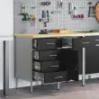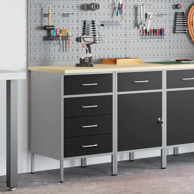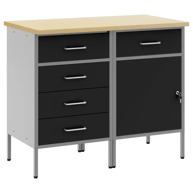 Ta delovna omara je pametno zasnovana za vsakogar, ki išče praktično shranjevanje, bodisi v garaži, delavnici ali domači pisarni. S svojim elegantnim črnim in sivim dizajnom se lepo prilega številnim stilom ter ti nudi urejeno mesto za orodja in potrebščine.