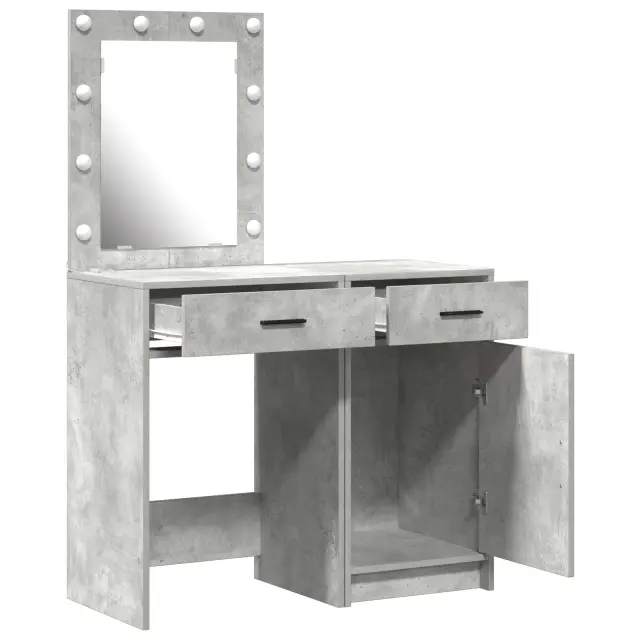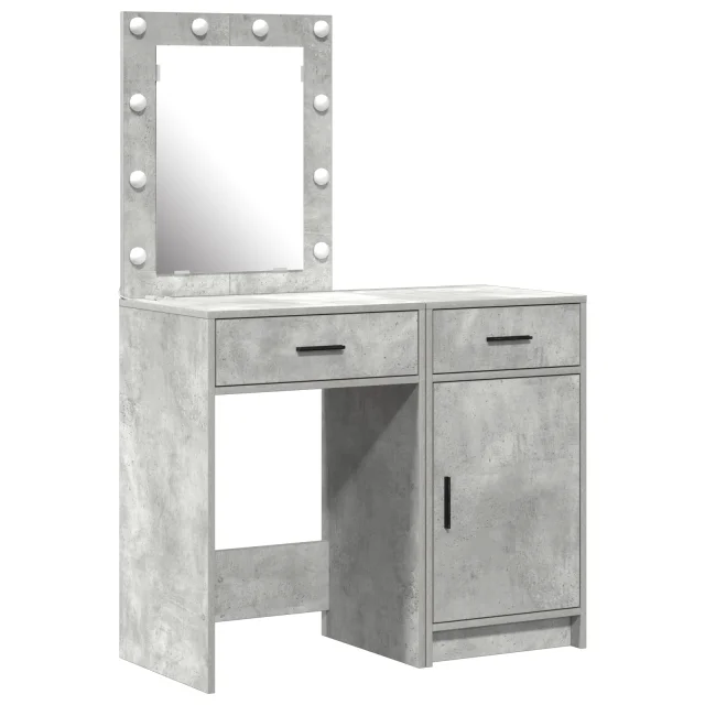 Ta moderna toaletna miza združuje luksuz in praktičnost, kar je odlična izbira za tvojo spalnico ali kopalnico. Njena gladka betonska siva barva in moderen dizajn oživita prostor ter nudita popolno mesto za tvojo dnevno lepotno rutino.