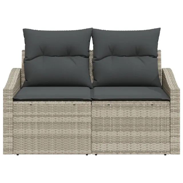 Ta moderen zunanji kavč iz kvalitetnega ratana z svetlo sivo poliester obleko prinaša stil in udobje na vašo teraso ali balkon. Zasnovan je za zunanjo uporabo in ima eleganten, minimalističen videz, ki dvigne vsak zunanji prostor ter ustvari toplo in prijetno mesto za sproščanje in druženje.