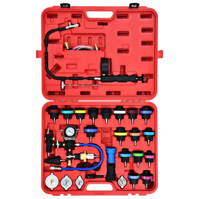 Ta komplet, narejen iz visoko kakovostnih materialov, je praktičen, odporen na obrabo in rjo. Vsebuje barvne testne pokrove hladilnika, ki omogočajo enostavnejše ločevanje pri izbiranju primernega testnega pokrova. Komplet ima en adapter več kot 27-delni komplet, ki je primeren za večino domačih in uvoženih vozil. S tlačno črpalko lahko puščanje v hladilnem sistemu testirate tako, da priključite adapter na odprtino za polnjenje hladilnika ali na posodo za hladilno tekočino.