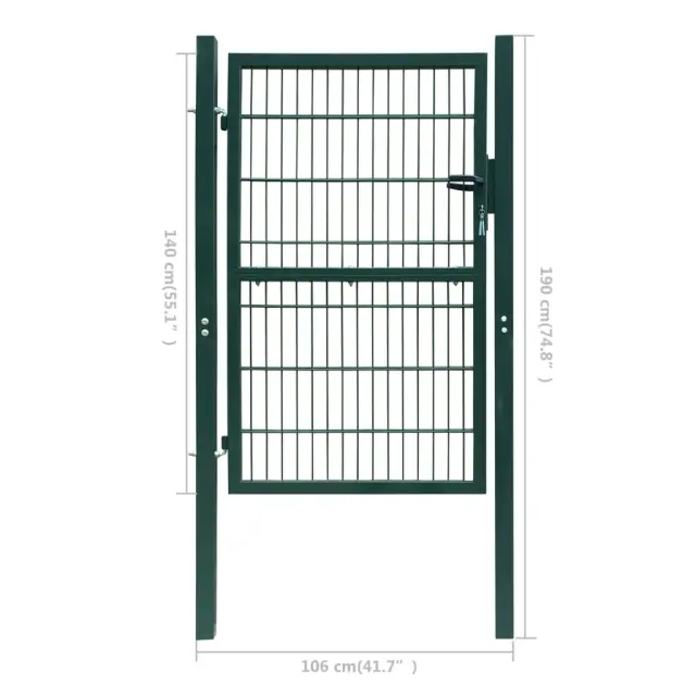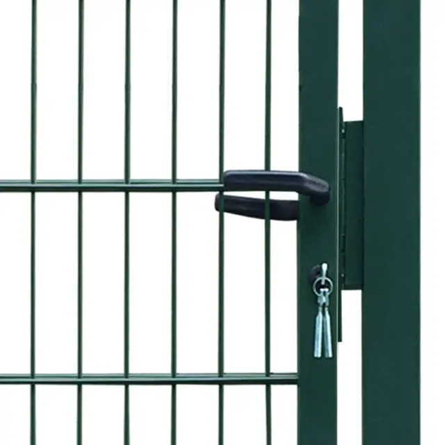 Ta 2D vrata za ograjo predstavljajo sodobno oblikovan in praktičen vhod za ločitev vašega vrta od zunanjega sveta. So zelo stabilna in vzdržljiva, zato bodo ta vrata za ograjo predstavljala praktično varnostno oviro za vaš vrt, dvorišče ali teraso. Naša vrtna vrata imajo eno vertikalno žico in dve horizotalni žici, ki prispevajo k dodatni trdnosti, zato bodo zagotovila visoko raven varnosti, hkrati pa bodo tvorila čudovit vhod na vašo posest. Vrata so narejena iz izjemno močnega jekla ter prašno premazana za zaščito pred rjo in korozijo. Ta 2D vrtna vrata imajo izjemno močne tečaje za enostavno montažo ter izjemno močno ključavnico z dvema priloženima ključema. Ta vrtna vrata predstavljajo odlično kombinacijo stila, moči, stabilnosti in odpornosti na korozijo!Barva: ZelenaMaterial: Jeklo s prašnim premazomCelotna velikost: 106 x 190 cm (Š x V)Velikost vratnega panela: 85 x 140 cm (Š x V)Velikost mreže: 200 x 50 mmVelikost cevi stebrička: 60 x 60 x 1,5 mm (D x Š x D)Velikost cevi panela: 40 x 40 x 1,3 mm (D x Š x D)Premer horizontalne žice: 6 mmPremer vertikalne žice: 5 mm2 kvadratna stebrička z močnimi tečaji za enostavno namestitevMočna ključavnica z 2 ujemajočima se ključema (priloženo) 141750