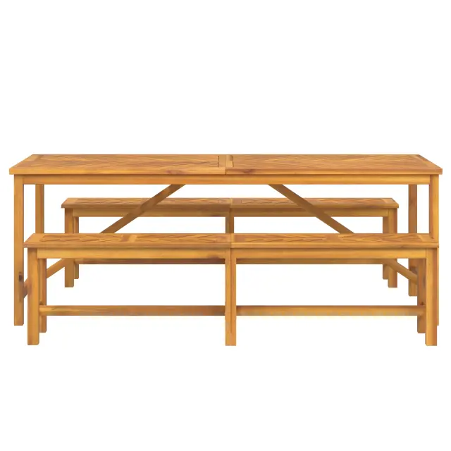 Ta zunanja jedilna garnitura združuje praktičnost in rustikalni čar, kar je super dodatek za vaš patio ali balkon. Narejena iz trdega akacijevega lesa, ima pravokotno mizo in dve prostorni klopi, kar ustvarja trdno in stilsko mesto za jed. Super je za druženje z družino.