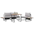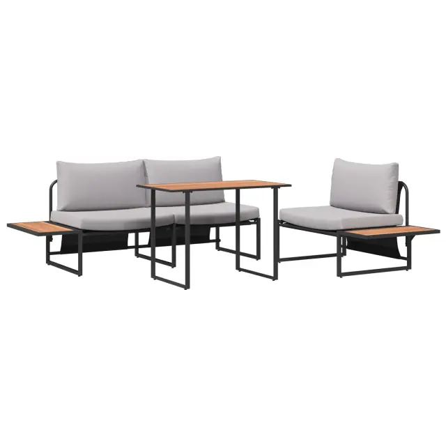 Ta zunanja jedilna garnitura ponuja eleganco in praktičnost, idealna za vsak balkon ali zunanji jedilni prostor. Moderna svetlo siva barva, skupaj s črnimi detajli, ustvari sijoče, sodobno vzdušje, ki izboljša tvoj zunanji prostor, hkrati pa ponuja dovolj sedenja za prijatelje in družino.