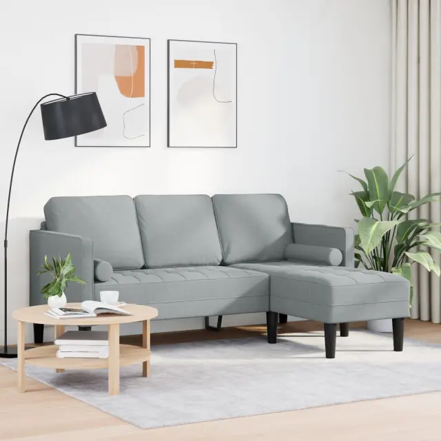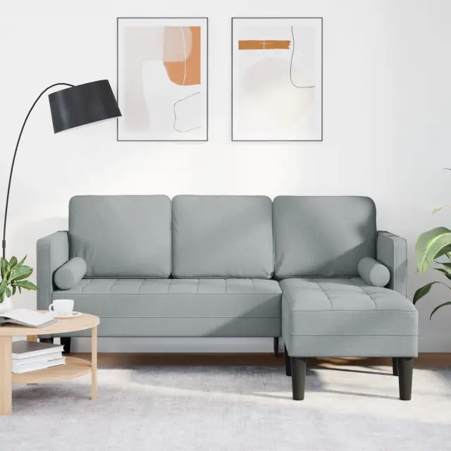 Ta svetlo siva kotna sedežna garnitura je odlična mešanica stila in udobja, ki tvojo dnevno sobo osveži. Popolna je za igranje ali sproščanje ob dobri knjigi. Sofisticirane linije in moderna zasnova ustvarjajo vabljiv občutek, medtem ko udobne blazine zagotavljajo trdno podporo, kar jo dela super za družinska in prijateljska srečanja.