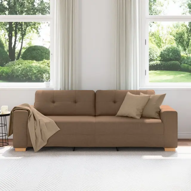 Ta velika sodobna 3-sedežna kavč združuje eleganco in udobje. Njegova rjava zasnova in čiste linije so odlične za družinska srečanja ali preprosto sprostitev. Prostorna zasnova ponuja udobje in doda sodoben pridih vašemu prostoru.