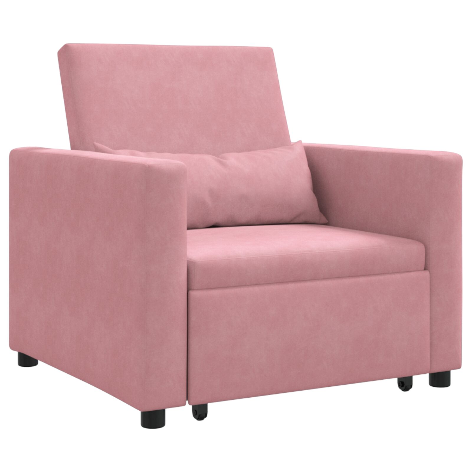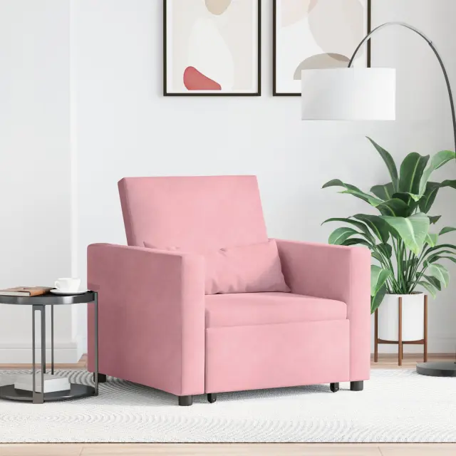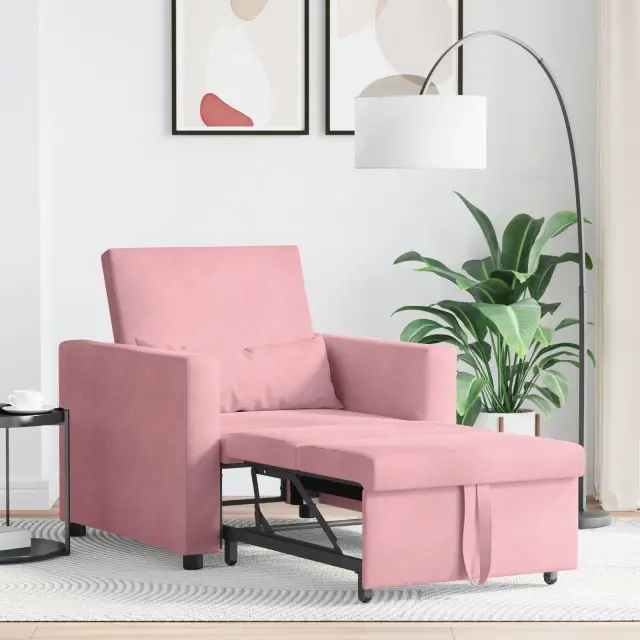 Ta večnamenski naslonjač je udoben za sedenje in zabaven kavč za spanje. Idealna izbira za majhne prostore ali dodatne sobe. Njegova gladka roza žametna tkanina doda kanček sofisticiranosti vsakemu dekorju, medtem ko ti nudi udoben prostor za branje ali sprostitev.