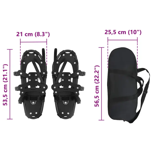 • Nastavljiva dolžina Prilagodite te snežnike svojemu koraku in udobju z enostavno nastavljivo mehaniko dolžine. Osvežijo se lahko od kompaktnega shranjevanja do polne širine. Ta funkcija dodaja plast personalizacije in zagotavlja večje zadovoljstvo na vsaki zimski pustolovščini.