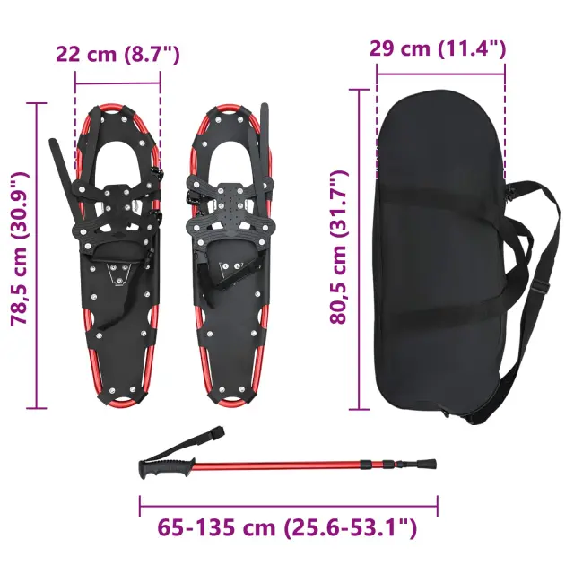 • Nastavljiva dolžina Prilagodite te snežnike svojemu koraku in udobju z enostavno nastavljivo mehaniko dolžine. Osvežijo se lahko od kompaktnega shranjevanja do polne širine. Ta funkcija dodaja plast personalizacije in zagotavlja večje zadovoljstvo na vsaki zimski pustolovščini.