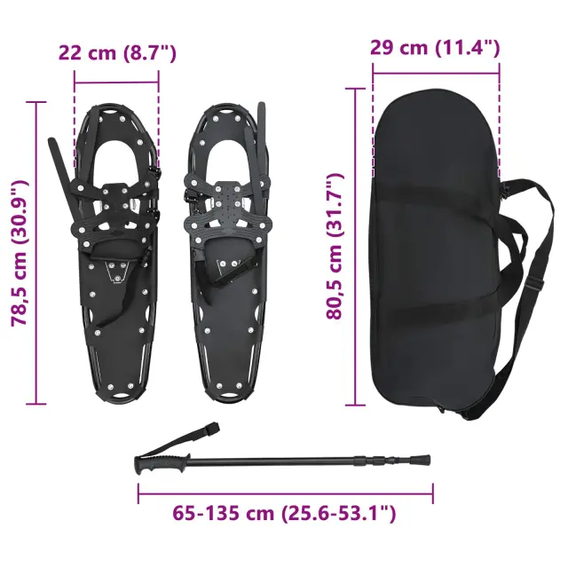 • Nastavljiva dolžina Prilagodite te snežnike svojemu koraku in udobju z enostavno nastavljivo mehaniko dolžine. Osvežijo se lahko od kompaktnega shranjevanja do polne širine. Ta funkcija dodaja plast personalizacije in zagotavlja večje zadovoljstvo na vsaki zimski pustolovščini.