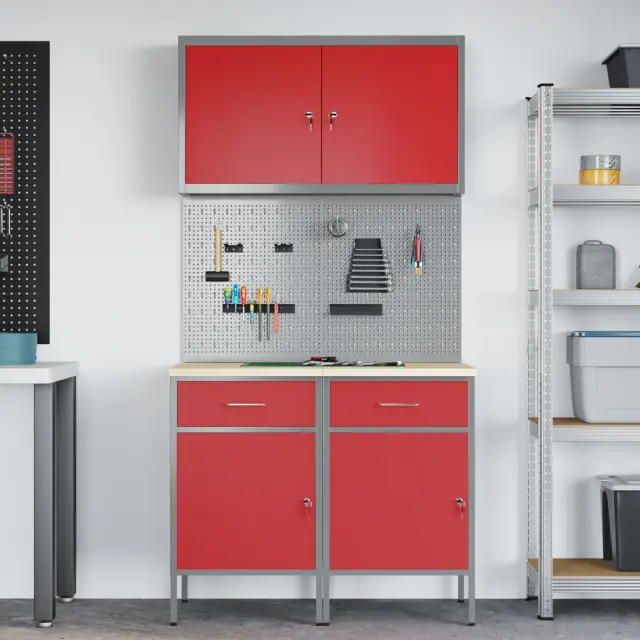 Ta industrijska delovna omarica je narejena za organizacijo orodja in dober videz. Njene svetle rdeče in sive barve resnično izstopajo v vsaki delavnici ali garaži, hkrati pa ponujajo praktične možnosti shranjevanja.
