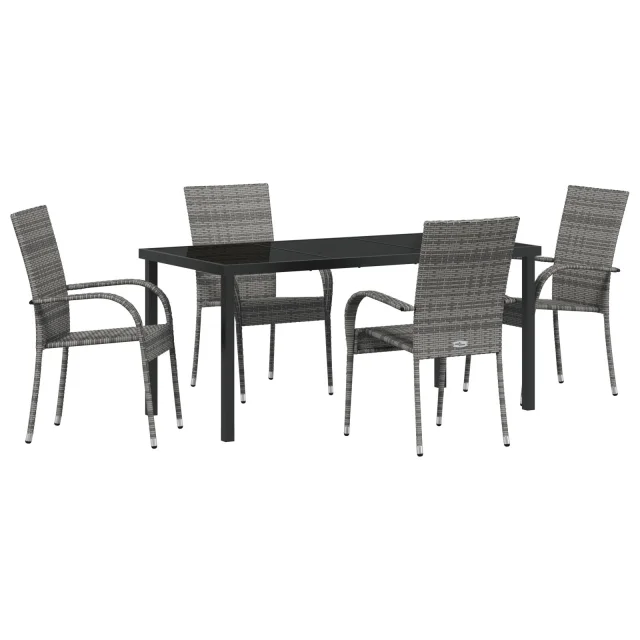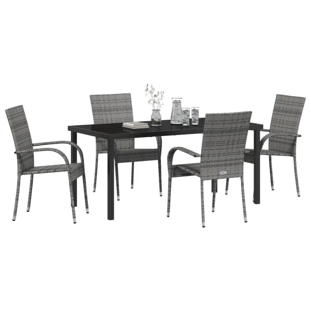 Ta jedilna garnitura za vrt prinaša pravo ravnotežje med slogom in praktičnostjo za vaše zunanje prostore. Ima elegantne zložljive stole, narejene iz trdnega sivega poli ratana, ki izgledajo super in so odlični za vsakodnevno uporabo.