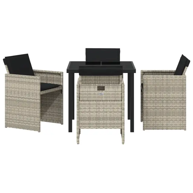 Ta 5-delna vrtna jedilna garnitura v svetlo sivi, s sodobnim dizajnom in trdno izdelavo, je popoln dodatek za vaš zunanji prostor. S trdno mizo in štirimi udobnimi stoli, ki imajo vremensko odporne blazine, ta set izboljša videz vašega balkona ali vrta in ponuja prijeten kotiček za druženje in sproščene obroke.