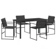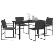 Ta vrtna jedilna garnitura povezuje moden stil in praktičnost, kar jo naredi super dodatek vašim zunanjim prostorom. S kul črno končno obdelavo in trdnimi materiali vam ta 5-delna garnitura ponuja štiri udobne stole in široko mizo, idealno za družinske obroke ali romantične večerje na patio. Textilene tkanina in prašno lakiran jekleni okvir sta zasnovana, da prenašata različne vremenske razmere, kar nudi stil in vzdržljivost.