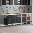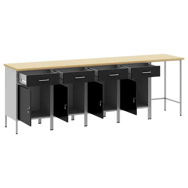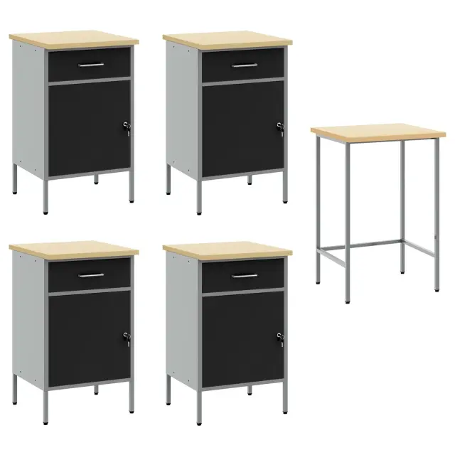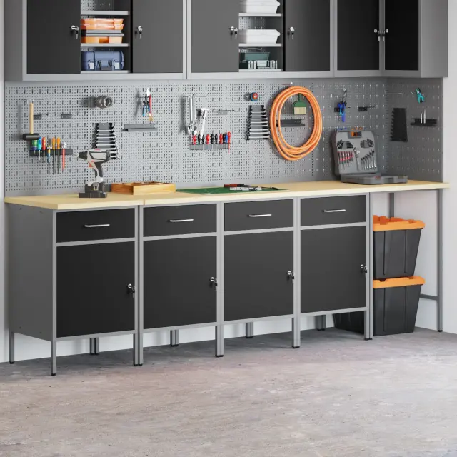 Ta kotni stol z delovnima omarama je odlična kombinacija stila in funkcionalnosti, popoln za vsako garažo ali delavnico. Narejen iz trdnega jekla in inženirskega lesa, ima eleganten mat zaključek, ki se super prilega industrijskemu videzu, nudijoč ti stabilno površino za vse vrste nalog ter omogoča, da so tvoja orodja vedno pri roki.