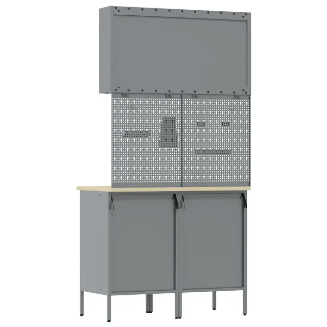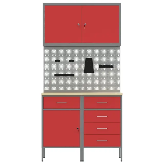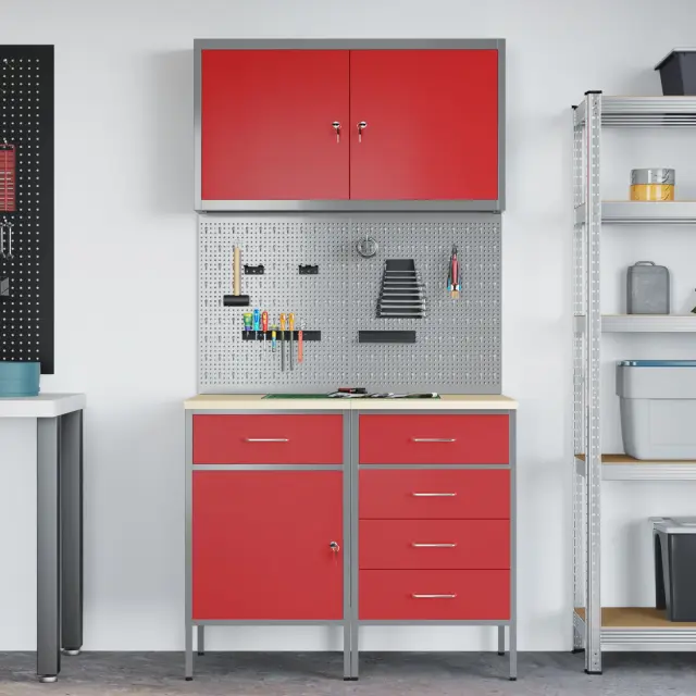 Ta industrijska delovna omara združuje funkcionalnost in trdno zasnovo, kar jo dela ključno za vsako garažo ali delavnico. S privlačno rdečo in sivo kombinacijo barv ne le izpolnjuje svojo nalogo, temveč tudi doda robusten šarm tvojemu delovnemu prostoru, ki se ujema z različnimi interierji.