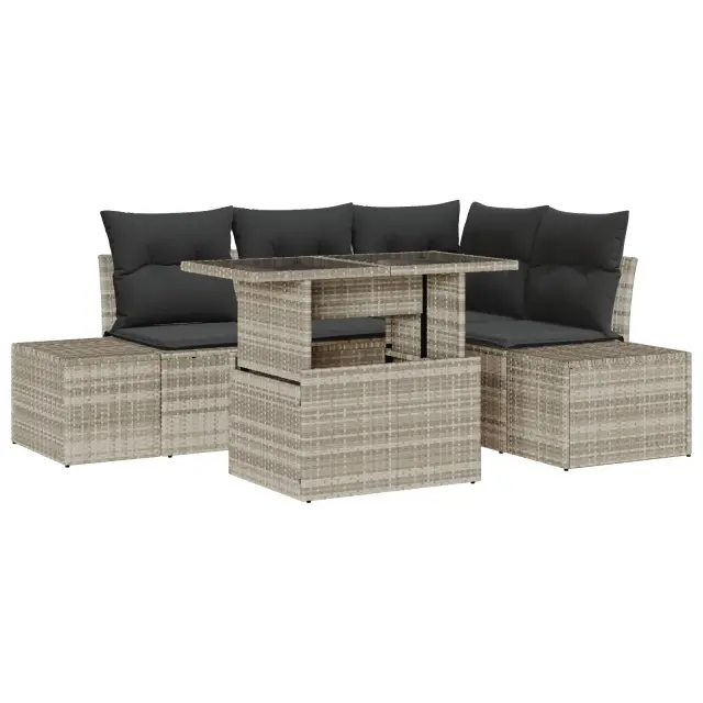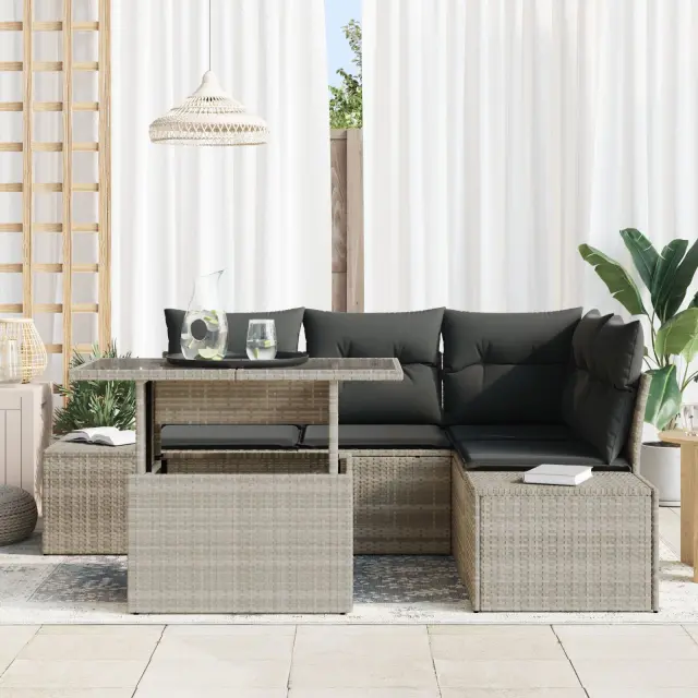 Ta set vrtnih kavčev iz 5 delov je odličen in funkcionalen izdelek za zunanje prostore. Ima sodoben videz in praktične lastnosti. Odličen je za družinska srečanja ali druženje s prijatelji. Ta set preobrazi vaš balkon, teraso ali vrt v udobno in elegantno okolje s svojim stilsko sivim ratanskim dizajnom in mehkimi blazinami.