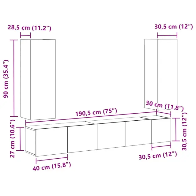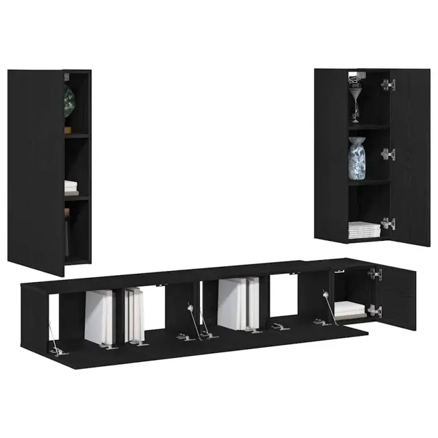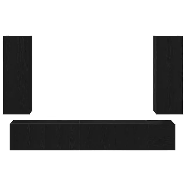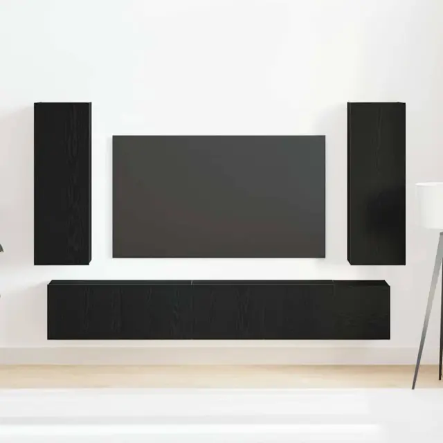 Povečaj svoj prostor s tem stenskim setom TV omaric. Zasnovan tako, da se prilega tvojemu domu, ponuja praktično shranjevanje. Slog črnega hrasta s teksturirano površino ne podpira le tvojega televizorja, ampak tudi lepo izpostavi tvojo dekoracijo.