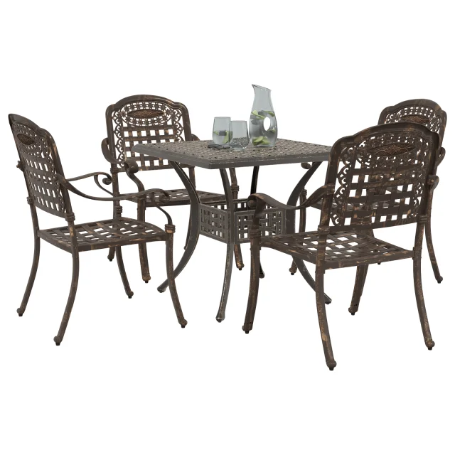 Ta kvadratna miza iz lito aluminija kombinira funkcionalnost in stil, kar jo dela idealno za zunanje in notranje prostore. Njeni privlačni geometrijski vzorci in bronast zaključek ustvarjajo sofisticirano vzdušje, kar je super za obedovanje na prostem ali uživanje v pijači na patioju ali balkonu.