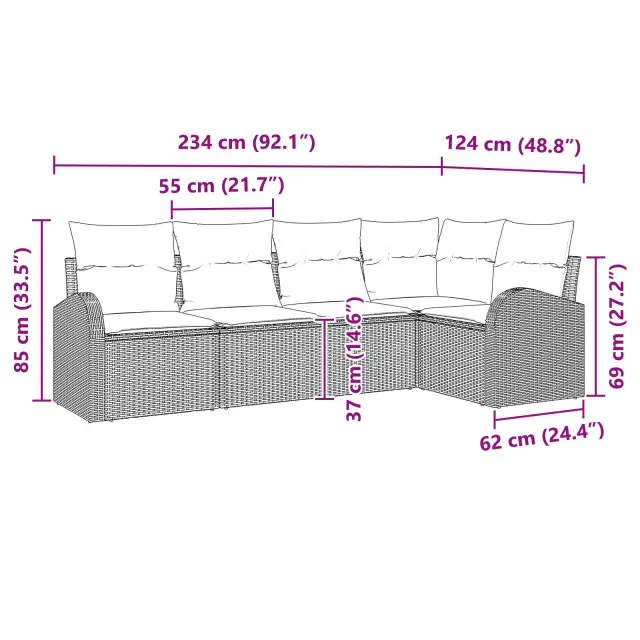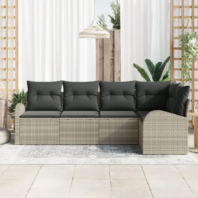 Ta sestava vrtnega kotnega kavča se osredotoča na udobje in prostor. S mehkimi blazinami iz poliestra in pletenim sintetičnim ratanom je super za druženje na vrtu ali balkonu - ne glede na to, ali imaš prijatelje ali se le sproščaš na soncu.