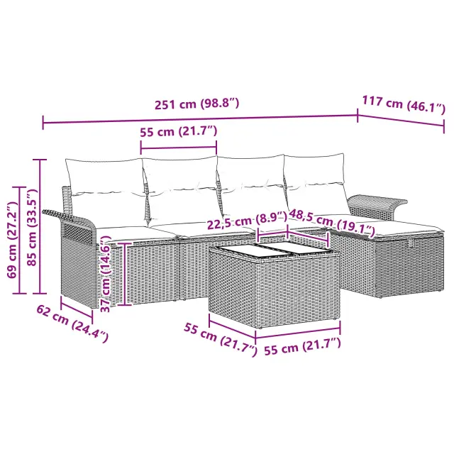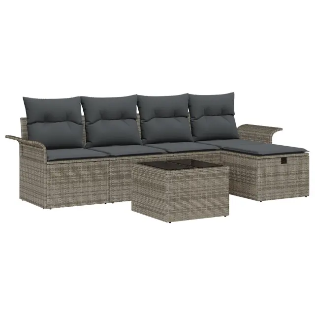 Ta 5-delna vrtna sedežna garnitura z blazinami dviga udobje in stil na novo raven. Pobrala je vrstni red, da izboljša tvoje zunanje prostore in ustvari prijetno vzdušje za družbo. Klasična mešanica vrhunskega poli ratana in mehkih poliestrskih blazin nudi prijetno izkušnjo, ki te spodbudi, da se sprostiš in uživaš v zabavnemvečeru, ne glede na to, ali je to lepo poletno popoldne ali posebna priložnost.