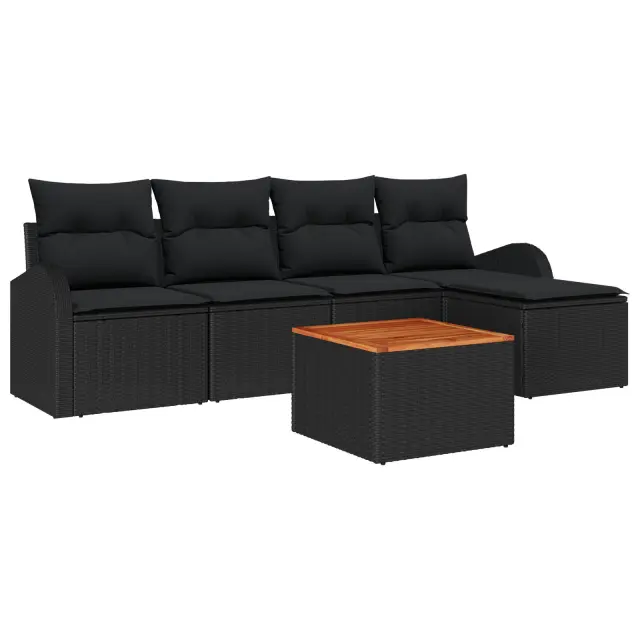 Ta vrtna sedežna garnitura je super dodatek za sproščanje na prostem. Ima sodoben izgled in trdno konstrukcijo, ki se prilega vsakemu patioju ali vrtu. Črno poli ratan zasnova in udobne črne blazine zagotavljajo udobje in videz, kar je idealno za druženje s prijatelji ali preprosto uživanje v miru na prostem.